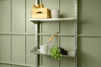 Zwei Regalböden mit Halteleisten für zusätzliche Ordnung an den Wänden.